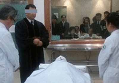 고인의 마지막 모습을 보며 장미로 이별을 고하는 모습